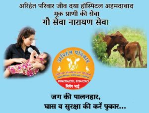 फिर भी धन के लालच में बिना दर्द महसूस किये मानव मुक प्राणी गाय के एक एक हिस्से को बेचकर अपना व्यापार व्यवसाय चलाते हैं जो एक अशोभनीय कार्य है। आओ पुनः हम अपना कर्तव्य को निभाते हुए गौ माता की रक्षा – सुरक्षा , खानपान व औषधियों की व्यवस्था में सहयोग करें भारत देश का अहमदाबाद स्थित एकमात्र गो सेवा केंद्र जहां गायों की सुरक्षा के साथ घायल बीमार गायों की तत्काल सेवा के लिए कटिबंधीय अरिहंत परिवार जो कि सेवा भाव कोही अपना लक्ष्य मानती है उन्हें अपना कर्तव्य निभाते हुए सहयोग करें आप भारत के किसी भी प्रांत या शहर में निवासरत है गौ माता के प्रति अपनी जिम्मेदारी निभाते हुए पुण्य लाभ में भागीदारी बन कर सहयोग के लिए संपर्क करें :-