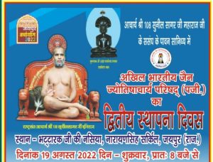 नई दिल्ली ! जैन ज्योतिष शास्त्र के द्वारा मनुष्य आकाशीय-चमत्कारों से परिचित होता है। फलतः वह जनसाधारण को सूर्योदय, सूर्यास्त, चन्द्र-सूर्य ग्रहण, ग्रहों की स्थिति, ग्रहों की युति, ग्रह युद्ध, चन्द्र श्रृगान्नति, ऋतु परिवर्तन, अयन एवं मौसम के बारे में सही-सही व महत्वपूर्ण जानकारी रख सकता है। इसलिए ज्योतिष विद्या का बड़ा महत्व है इसी को ध्यान में रखते हुए आगामी शुक्रवार दिनांक 19 अगस्त 2022 को प्रातः 8:00 बजे से नारायण सर्किल भट्टारक जी की नसिया जयपुर में विराजित आचार्य श्री 108 सुनील सागर जी महाराज (ससंघ) के पावन सानिध्य में अखिल भारतीय जैन ज्योतिषाचार्य परिषद (पंजी.) का द्वितीय स्थापना दिवस मनाया जाएगा।