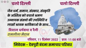 जिस प्रकार गुजरात प्रांत के जैन तीर्थ श्री गिरनार जी पर धर्म के नाम से अपना कब्जा जमा रखा है उसी को ध्यान में रखते हुए । 20 जैन तीर्थँकरों की मोक्ष स्थली श्री सम्मेद शिखर जी “पारसनाथ” पर्वतराज को ‘पारसनाथ हिल’ लिखकर इसे ‘वन्य जीव अभ्यारण’ का मात्र एक भाग घोषित कर इसका अस्तित्व व प्राचीनता को नष्ट करने के प्रयास और पारसनाथ हिल व मधुवन में गैर धार्मिक गतिविधियों को बढ़ावा देने के लिए इन्हे ‘इको सेंसिटिव जोन’ के अंतर्गत घोषित कर पर्यटन, पर्यावरण पर्यटन को बढ़ावा देने वाले झारखण्ड सरकार की अनुशंसा पर केंद्रीय वन मंत्रालय द्वारा जारी 2 अगस्त 2019 के नोटिफिकेशन के विरोध में और सम्पूर्ण पर्वत को जैन समाज का पवित्र “जैन तीर्थस्थल” घोषित कराने हेतु 11 दिसंबर को प्रातः 11:00 बजे देशव्यापी धर्म सभा ब रैली का आयोजन रामलीला मैदान दिल्ली व अन्य शहरों में किया जा रहा है। देश के विभिन्न सभी प्रदेशों मे निवास सभी श्रावक श्रेष्ठी जनों से विश्व जैन संगठन के साथ सभी तीर्थ क्षेत्र सुरक्षा संघ संगठन आप सबसे आव्हान करते हैं कि आप सभी अपने-अपने निवास स्थल शहरों , कस्बो एव गावों में भी सम्मेद शिखरजी को शासन प्रशासन द्वारा सिर्फ “जैन तीर्थ “” घोषित करवाते हुए उसकी सुरक्षा मैं सहयोग कर ते हुए जैनत्व की संस्कार – संस्कृति को सुरक्षित कराए विस्तृत जानकारी के लिए आप संपर्क करें ।