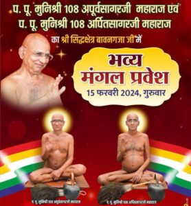 निमाड़ गौरव मुनिश्री 108 अपूर्व सागरजी महाराज एवं मुनिश्री 108 अर्पित सागरजी महाराज का श्री सिद्ध क्षेत्र बावनगजा जी में भव्य मंगल प्रवेश 15 को