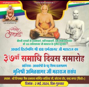फिरोजाबाद ! ( देवपुरी वंदना ) बीसवीं शताब्दी के प्रथमाचार्य, चारित्रचक्रवर्ती, धर्म-साम्राज्यनायक श्री 108 शान्तिसागर जी महाराज के तृतीय पट्टाधीश आचार्य शिरोमणि श्री 108 धर्मसागर जी महाराज का 37 वाँ समाधि दिवस समारोह आगामी गुरुवार 2 मई 2024 को आचार्य श्री के पट्ट शिष्य प्रज्ञा श्रमण मुनिश्री 108 अमित सागर जी महाराज ससंघ के सानिध्य उत्तर प्रदेश की शान चूड़ियों की नगरी स्थित श्री दिगम्बर जैन रत्नत्रय मन्दिर-नशिया जी, कोटला रोड, चन्द्र नगर फिरोजाबाद मे होने जा रहा है।