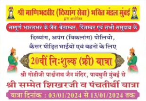 मुंबई !  श्री शिखरजी भारत के झारखंड राज्य के गिरिडीह ज़िले में छोटा नागपुर पठार पर स्थित एक पहाड़ी है जो विश्व का सबसे महत्वपूर्ण जैन तीर्थ स्थल भी है। ‘श्री सम्मेद शिखर जी’ के रूप में चर्चित इस पुण्य क्षेत्र में जैन धर्म के 24 में से 20 तीर्थंकरों (सर्वोच्च जैन गुरुओं) ने मोक्ष की प्राप्ति की। यहीं 23 वें तीर्थकर भगवान पार्श्वनाथ ने भी निर्वाण प्राप्त किया था। माना जाता है कि 24 में से 20 जैन तीर्थंकरों ने यहां पर मोक्ष प्राप्त किया था।जो चार हजार सिढीयो पर स्थित है 1,350 मीटर (4,430 फ़ुट) ऊँचा यह पहाड़ झारखंड का सबसे ऊंचा स्थान भी है। सबसे पवित्र तृतीय क्षेत्र पर हर कोई जाना चाहता है ! श्री मणिभद्र वीर दिव्यांग सेवा भक्ति मंडल द्वारा आयोजित, मुम्बई सम्पूर्ण भारत के जैन श्वेताम्बर एवम् दिगम्बर के समस्त पंथ समुदाय के दिव्यांग गण, पोलियों ग्रस्त, कैंसर , पैरालिसिस, लकवा पीड़ित भाई बहनों के लिए महातीर्थ यात्रा का आयोजन किया जा रहा है। श्री गोडी जी पार्श्वनाथ जैन मन्दिर, पाय धूनी, मुम्बई से रेल द्वारा आयोजित है ( ए.सी.कोच ) द्वारा 21 वी निःशुल्क यात्रा वंदना श्री सम्मेद शिखर जी, रुजुबलिका तीर्थ, राजगिरी तीर्थ, पावापुरी तीर्थ, लच्छवाड़ तीर्थ, कागंधी तीर्थ, गुनियाजी तीर्थ, कुंडलपुर तीर्थ, पंच तीर्थ का 02 जनवरी 2025 से 12 जनवरी 2025 तक आयोजन किया जा रहा है।( 70% ) से ज्यादा दिव्याजन व कम उम्र की लड़की के साथ परिवार का सदस्य भी नि : शुल्क रहेगा। आयोजकों ने निवेदन किया हैं की कृपया बेस्ट कैंसर व हाथ के पोलियो वाले फार्म नही भरे श्री को विदित है कि लगातार विगत 20 वर्षो में 6560 हमारे दिव्यांग जैन भाई – बहन व सहयोगी को नि:शुल्क यात्रा कराने का लाभ व 8 वर्षो से पालीताना मे विराजमान हमारे अशक्त गुरु भगवंत व साध्वी जी भगवंतो को गिरिराज डोली से यात्रा कराने का लाभ दानदाता परिवार व मंडल को मिला हैं। नोट कृपया बेस्ट कैंसर व हाथ के पोलियों वाले फार्म ना भरे फार्म पोस्ट या मोबाईल से भेजे जाएंगे व फार्म जमा करने की अंतिम तारीख 10 नवंबर 2024 है संपर्क श्री मणिभद्र वीर दिव्यांग सेवा भक्ति मंडल मुम्बई, प्रकाश ढालावत जैन खी मेल गोडीजी चाल शॉप न,229 गुलालवाड़ी मुम्बई 400002 मो,09869672417 , दिलीप जैन मुम्बई मो. 9172280000, कमलेश शाह घाटकोपर मो 9820476766, प्रवीन जैन थाना 8369984901, प्रतिक जैन पेटलावद मध्य प्रदेश ,7879019747, जीवन लाल जैन नागदा जंक्शन, मो 9179662633