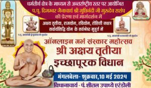 प.पू. दिगम्बर जैनाचार्य श्री 108 गुप्ति नंदी जी गुरूदेव ससंघ की प्रेरणा एवं मार्गदर्शन में अक्षय तृतीया, राजयोग, रवियोग, रोहिणी नक्षत्र, स्वार्थ सिद्ध योग के सर्वश्रेष्ठ मुहूर्त में प.पू. आचार्य श्री 108 कनकनंदी जी गुरुदेव ऑनलाइन गर्भ संस्कार महोत्सव, श्री अक्षय तृतीया इच्छा पूरक विधान का आयोजन शुक्रवार, 10 मई 2024 को करवा रहे है।