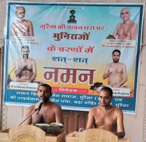 श्री 1008 पार्श्वनाथ दिगंबर जैन पंचायती बड़ा जैन मंदिर में एक दिन के अल्प प्रवास पर आचार्य वसुनंदी जी महाराज के परम प्रभावक शिष्य श्री शिवानंद जी महाराज एवम प्रश्मानंद जी महाराज का मंगल आगमन हुआ जैन समाज मुरेना द्वारा युगल मुनिराजों की भव्य अगवानी की गई। बड़े जैन मंदिर जी की धर्मसभा में सैकड़ों की संख्या में साधर्मी बंधुवर, माताएं एवम युवा साथी उपस्थित रहे। शाम को पूज्य युगल मुनिराजों ने मुरेना से श्री सिद्धक्षेत्र सोनागिर जी के लिए मंगल पद विहार किया