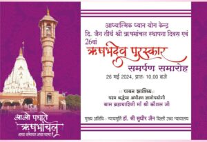 गाजियाबाद ! आध्यात्मिक ध्यान योग केन्द्र दि. जैन तीर्थ श्री ऋषभांचल स्थापना दिवस एवं 26वां ऋषभदेव पुरस्कार सम्मान समारोह का भव्य आयोजन आगामी रविवार, 26 मई 2024, प्रातः 10.00 बजे जिसमें