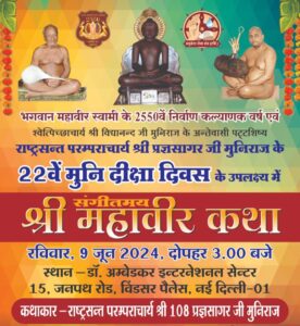 9 जून को दिल्ली में आचार्य प्रज्ञ सागर जी का मुनि दीक्षा दिवस समारोह एवं महावीर कथा का आयोजन