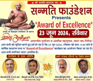 दिल्ली ! आचार्य श्री108 विद्याभूषण सन्मति सागर अवार्ड समारोह 23 जून को दिल्ली में आयोजित होने जा रहा है।