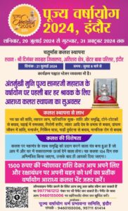 आयोजक : पूज्य वर्षायोग धर्म प्रभावना समिति, इंदौर – संपर्क : 9460155006, 95711 61414