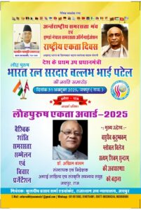 शौर्य वीर राजस्थान प्रांत की गुलाबी नगरी जयपुर के जैन समाज के वरिष्ठ पत्रकार डा.अखिल बंसल 31 अक्टूबर 2025 को “लौह पुरुष एकता अवार्ड” से सम्मानित