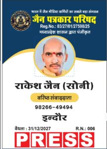 इंदौर । (देवपुरी वंदना) मध्य प्रदेश जैन समाज के इतिहास में पहली बार राष्ट्र – समाज के सजग, जागरूक,सतर्क जैन मीडिया साथियों के लिए गर्व का क्षण आने वाला है। जैन पत्रकार परिषद के तत्वावधान में आगामी 29 मार्च 2026, रविवार को झलारिया मठ, उज्जैन में ‘जैन पत्रकार अवार्ड समारोह’ का भव्य आयोजन किया जाएगा। इस समारोह में प्रदेशभर से जैन पत्रकार हिस्सा लेंगे।