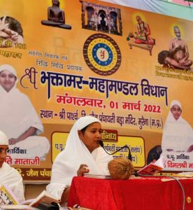 मुरैना ! ( देवपुरी वंदना ) श्री भक्तामर महामंडल विधान में भगवान 1008 श्री आदिनाथ जी के गुणों का स्तवन एवं महिमा का वर्णन है जिसमें 48 श्लोकों से युक्त इस विधान में अपने आप में असीम शक्ति का महत्व देखा गया है श्री भक्तामर महामंडल विधान में बैठने और पाठ करने से मानव जीवन के सभी कष्टों का निवारण होता है उक्त विचार मध्य प्रदेश के मुरैना शहर स्थित श्री पार्श्वनाथ दिगंबर जैन बड़ा मंदिर मैं आयोजित विधान में गणिनी आर्यिका रत्न 105 आर्षमति माताजी ने कहीं । मुरैना शहर के सकल दिगंबर जैन समाज , श्री पारसनाथ दिगंबर जैन पंचायती बड़ा मंदिर कमेटी के पदाधिकारियों एवं सदस्यों के साथ दिगंबर जैन समाज के सभी महिला मंडल सहित समाज के सभी श्रावक – श्रेष्ठी जनों ने श्री भक्तामर महामंडल विधान का लाभ लिया।